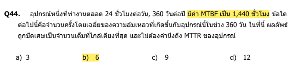 จำนวนครั้งเสียเฉลี่ย = เวลาทำงานทั้งหมด / MTBF = 8{,}640 / 1{,}440 = 6 ครั้ง.