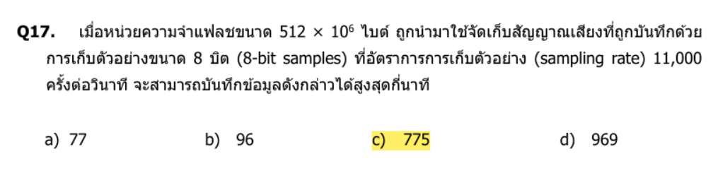 \text{เวลา (วินาที)} = \frac{\text{จำนวน sample ทั้งหมด}}{\text{sampling rate}} = \frac{512 \times 10^6}{11,000} = 46545.45\ \text{วินาที}