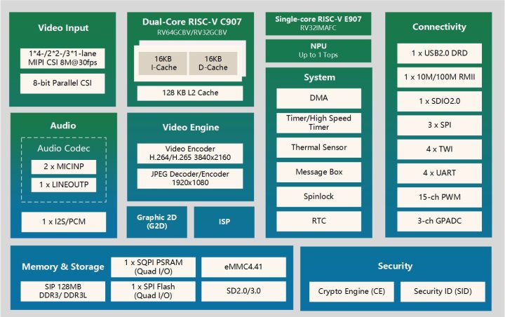 | CPU หลัก | Dual-Core RISC-V XuanTie C907 (RV64GCBV/RV32GGCBV) สูงสุด 1.4GHz, รองรับ RVV 1.0 extensions |