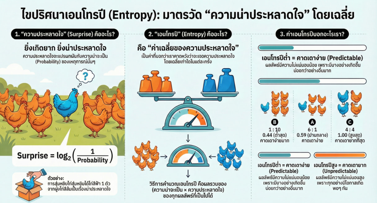 เอนโทรปีไม่ใช่แค่ “ความไร้ระเบียบ” แต่เป็นการวัดจำนวนสถานะที่เป็นไปได้ของระบบ กฎข้อที่สองของเทอร์โมไดนามิกส์บอกเราว่าเอนโทรปีมีแนวโน้มเพิ่มขึ้น และนี่เป็นเหตุผลพื้นฐานที่อธิบายทิศทางของเวลา ประสิทธิภาพของเครื่องจักร และแม้กระทั่งการดำรงอยู่ของชีวิตบนโลก