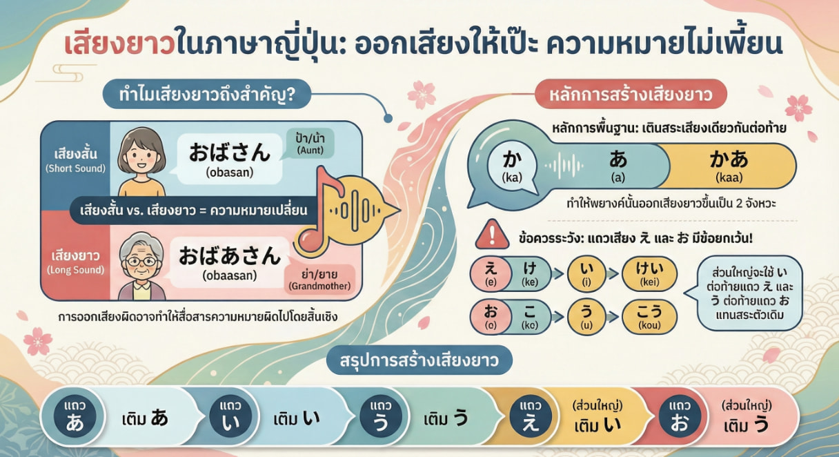 การทำให้เสียงสั้นกลายเป็นเสียงยาวในภาษาญี่ปุ่น ทำได้โดยการเติมตัวอักษรที่เป็น “ตัวแม่” หรือสระประจำแถวนั้นๆ ต่อท้าย, โดยมีกฎพื้นฐานดังนี้: